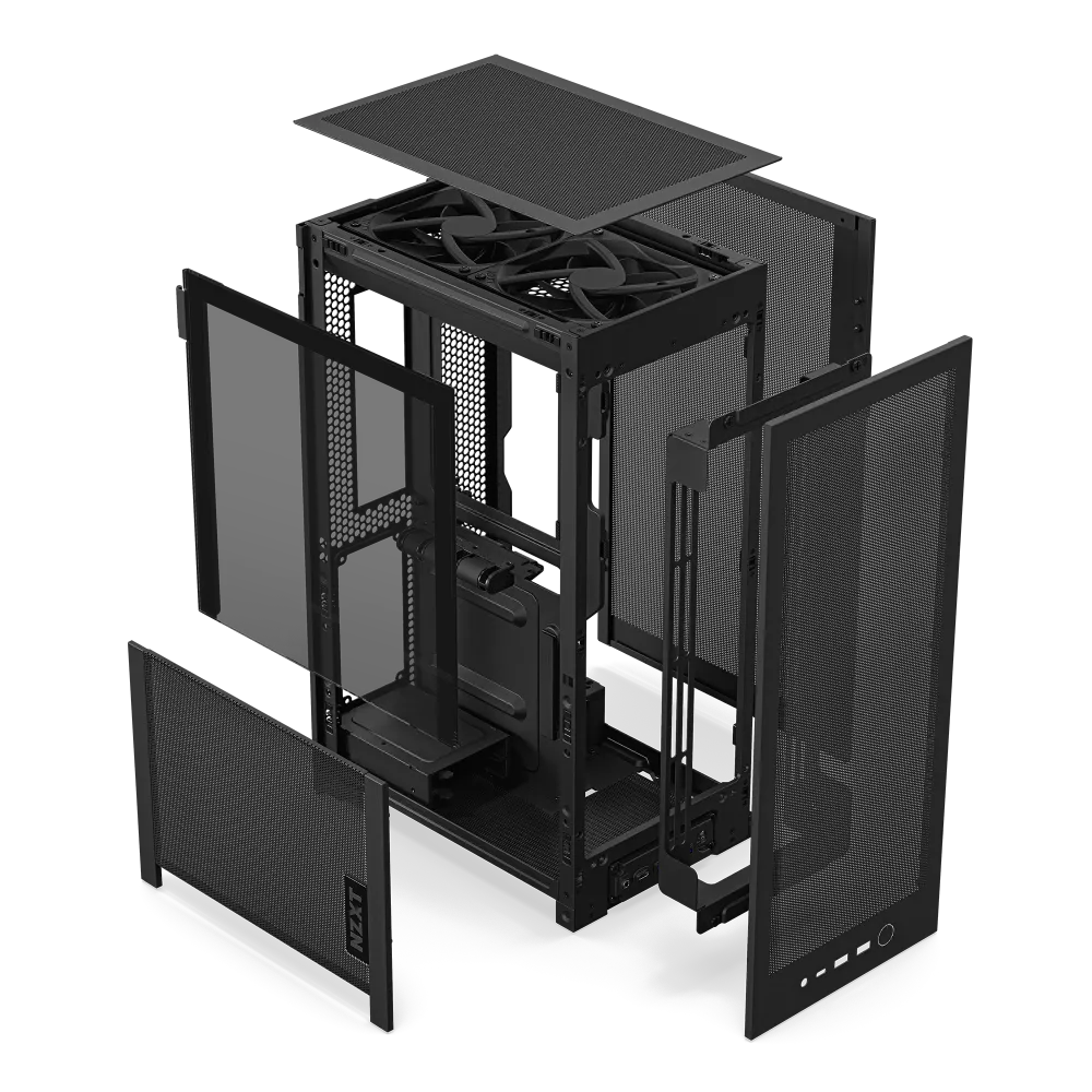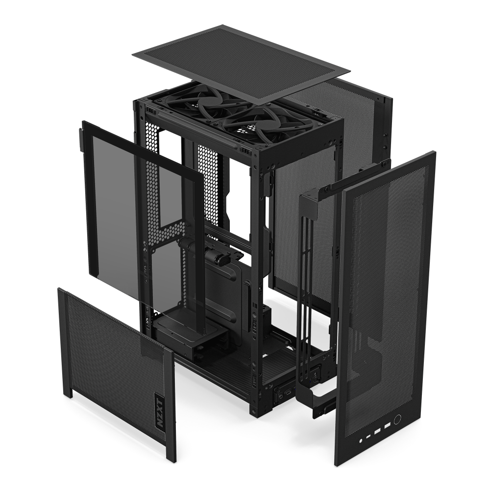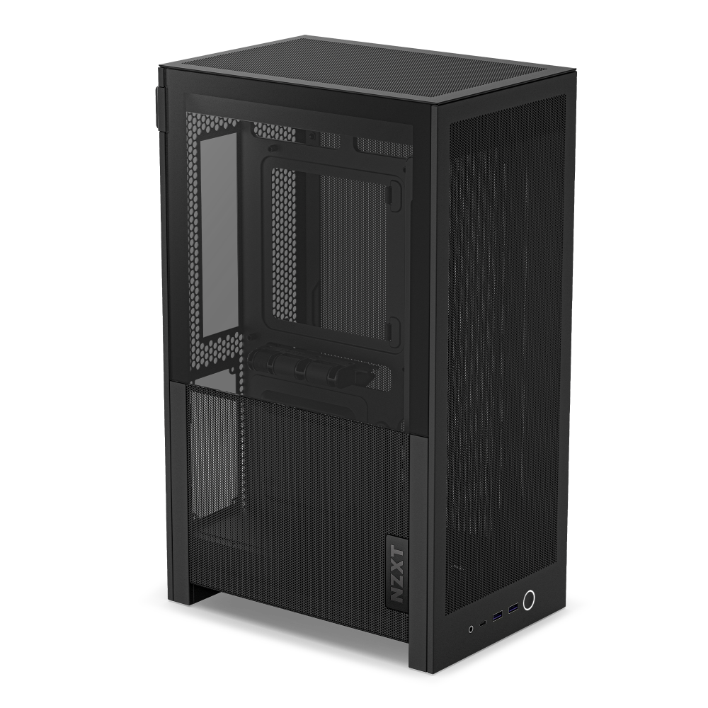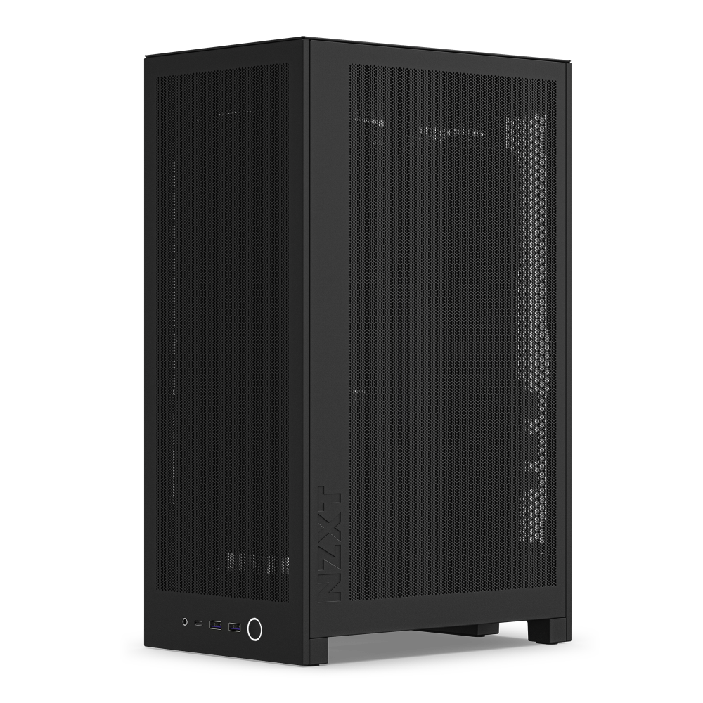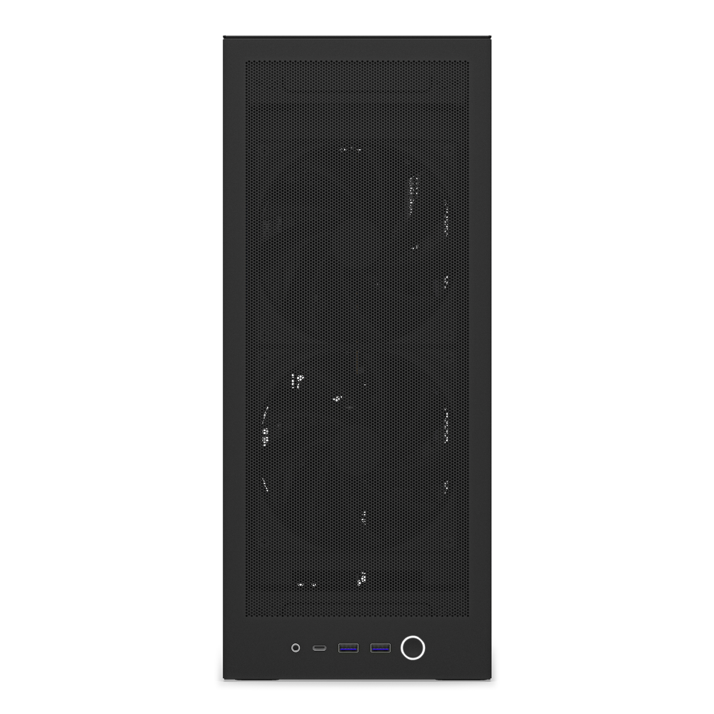 H2 Flow は、18.1 x 26.3 cmとA4用紙より小さな設置面積、高さ43.5cmで約21リットルの容積のコンパクトなケースながら、底面以外すべてに微細&多孔メッシュパネルを採用することで高い冷却性能を両立しています。